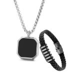 Fashion Frill Bracelet | Stainless Steel Geometric Silver Pendant With Black Leather Bracelet